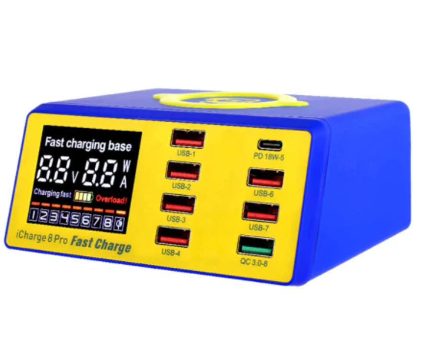 ICHARGE 8 Pro Mechanic Cargador USB 8 Puertos, Carga Inalámbrica Con Pantalla Digital, Entrada Tipo C Vikingotek